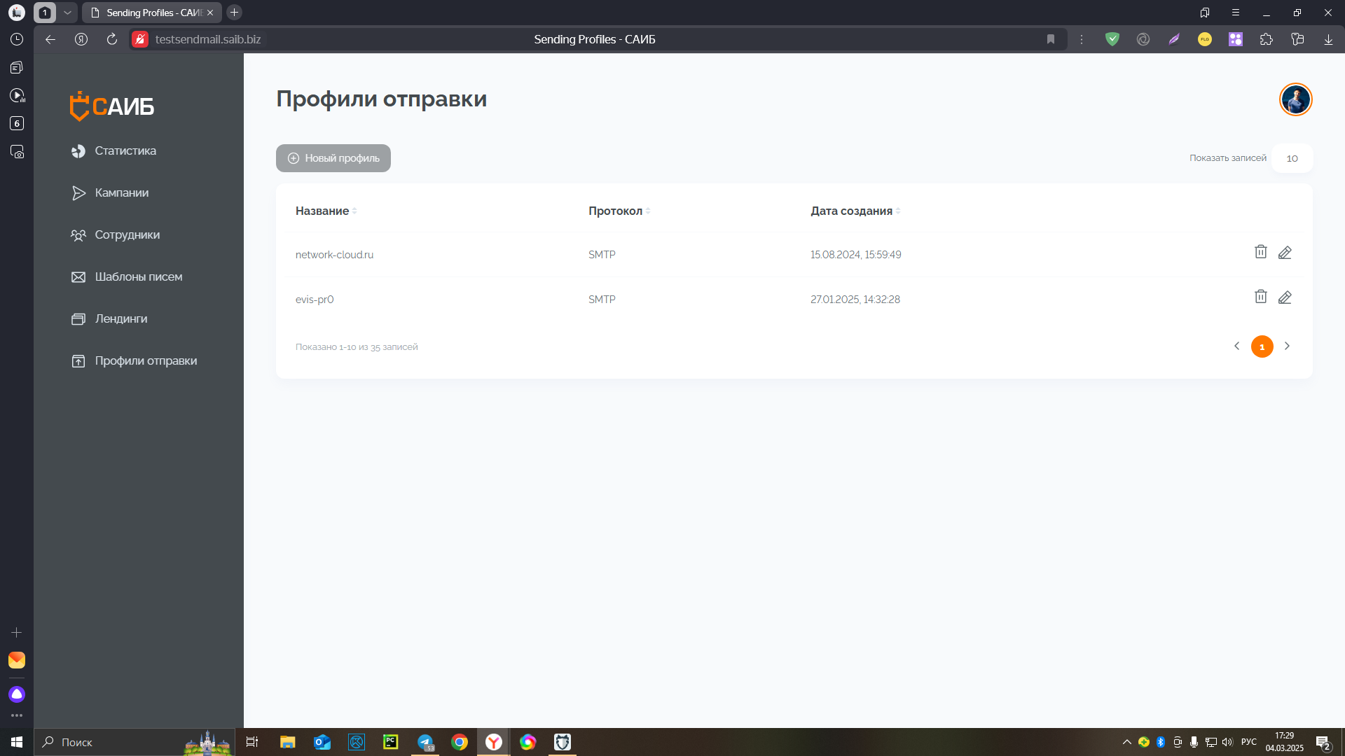 Не работает кнопка "Новый профиль" в Профилях отправки